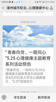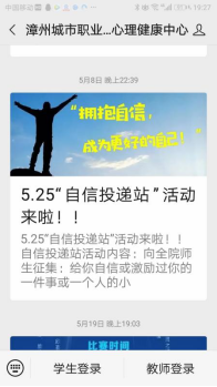 2021年5月25日是第22个大学生心理健康日,2021年恰逢中国共产党建党一百周年。为帮助学生正确认识自我、接纳自我、乐观自信地面对生活,结合学习建党一百年奋斗历程中的感人事迹和先进精神,分享提升自信的好办法,加大培养学生自信的力度,学生工作处心理咨询中心举办了“青春向党,一路同心”主题宣传教育系列活动。